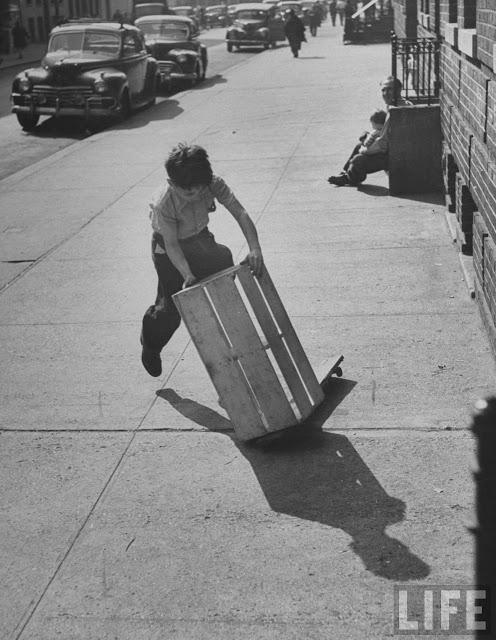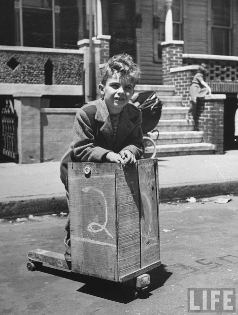 Young boy playing w. his fruit crate scooter which he made by nailing the wheel parts fr. an old roller skate to a wooden plank & adding the crate. |