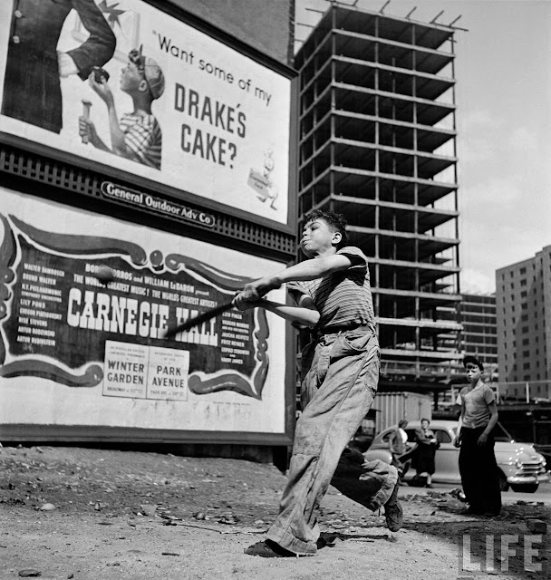 Young boys playing stickball in vacant lot next to billboard advertising the Drake’s Cake & the movie “Carnegie Hall” nr. apt. bldg. construction. |