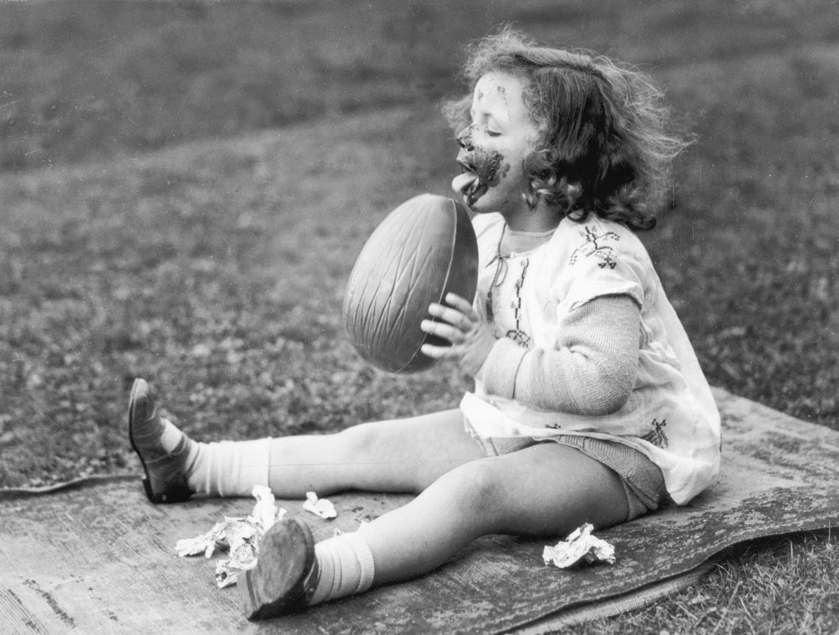 | Girl enjoys a huge chocolate Easter egg in 1930. (Getty Images) |