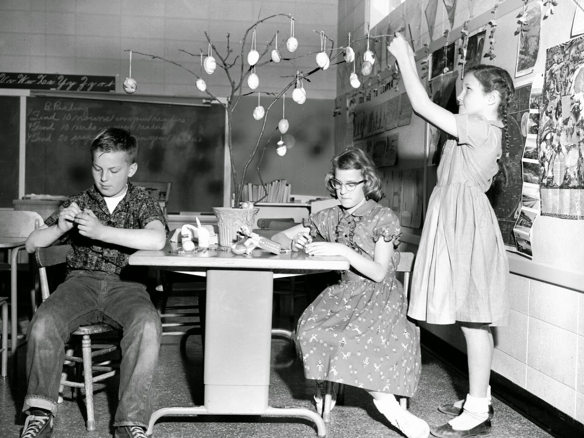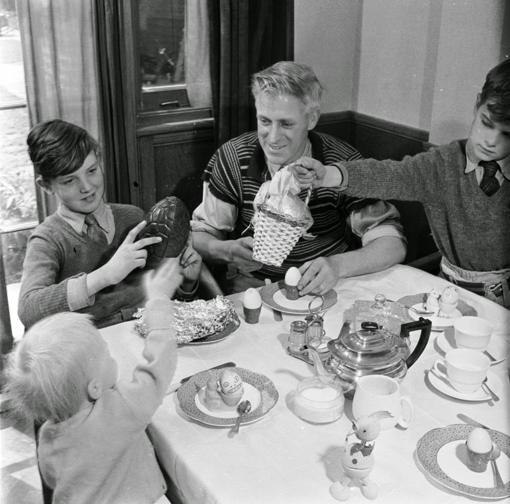 | The traditional exchange of chocolate eggs at Easter breakfast in 1955. (Evans/Three Lions/Getty Images) |