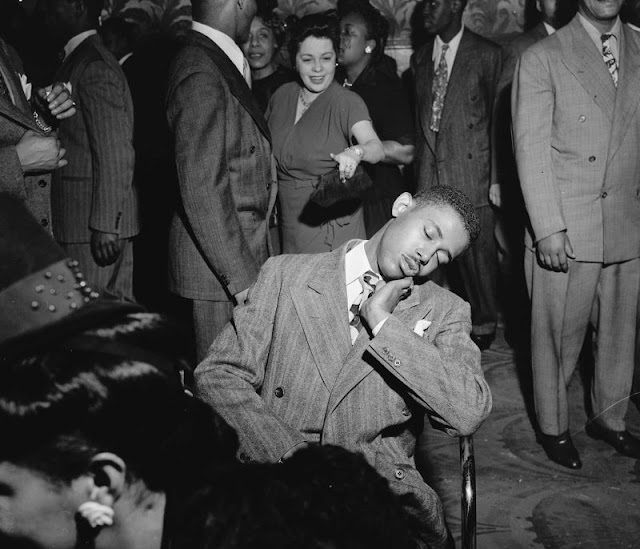 | A short man, wearing a zoot suit, stands on a chair to get a better view of the dance floor at the Savoy Ballroom, 1940s. (FPG) |