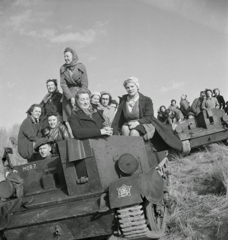 Women war workers from J & F Pool Ltd, a small West Country arms factory, travel to a test range in a Universal carrier, Mark I, 1943. They have been rewarded by the Ministry of Supply for producing 1 million mortar bombs with a trip to see some of their handiwork in action. |