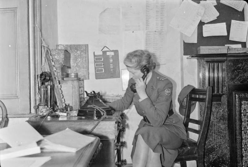 A woman of the American Ambulance Great Britain receives a telephone call requesting their attendance at an incident, 1944. |