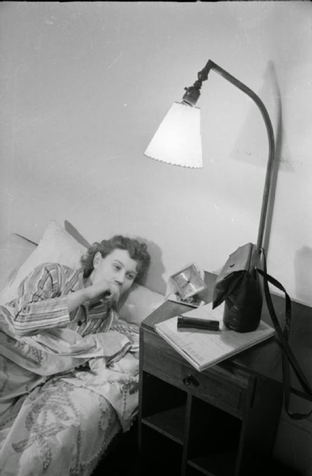 Mrs Day wakes up at 7am at her home in Drayton Gardens, South Kensington. On the bedside cabinet, her gas mask, torch and a book are ready, in case a quick dash to the air raid shelter is required in the night. |