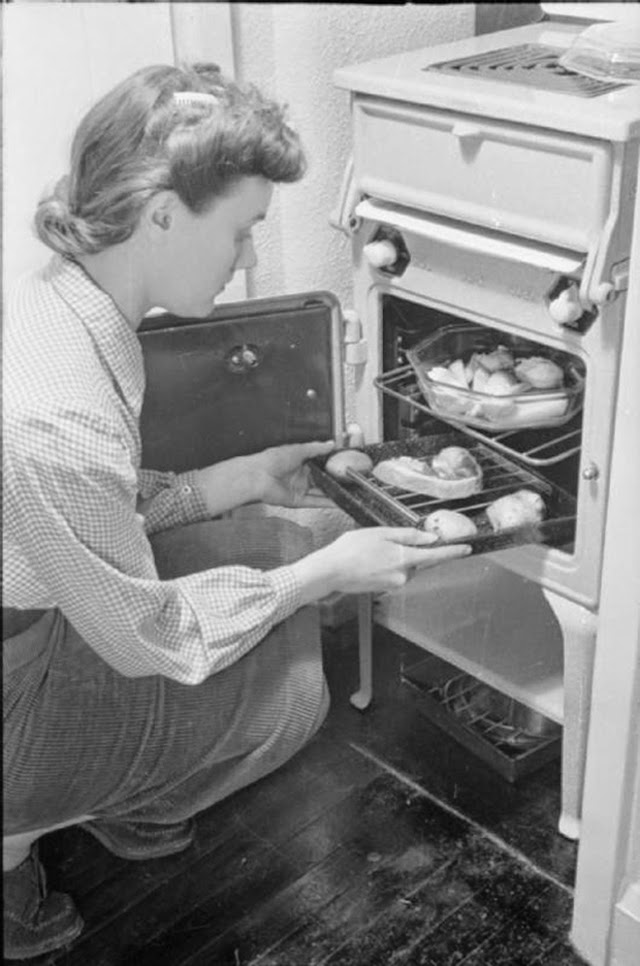 Mrs Day puts her dinner into the oven after a busy day. The Ministry of Food encouraged people to cook their entire meal in the oven as a way to save fuel. |
