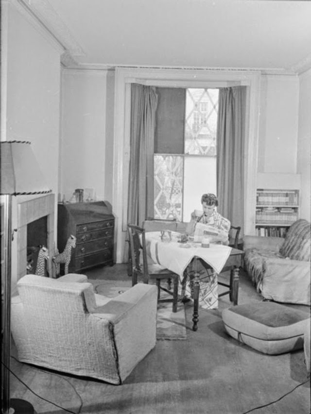 Mrs Day opens her window to let some air, and light, into her South Kensington home. The window panes have been replaced by oiled linen stretched over the frame, as the glass was knocked out by a nearby bomb a short while ago. |