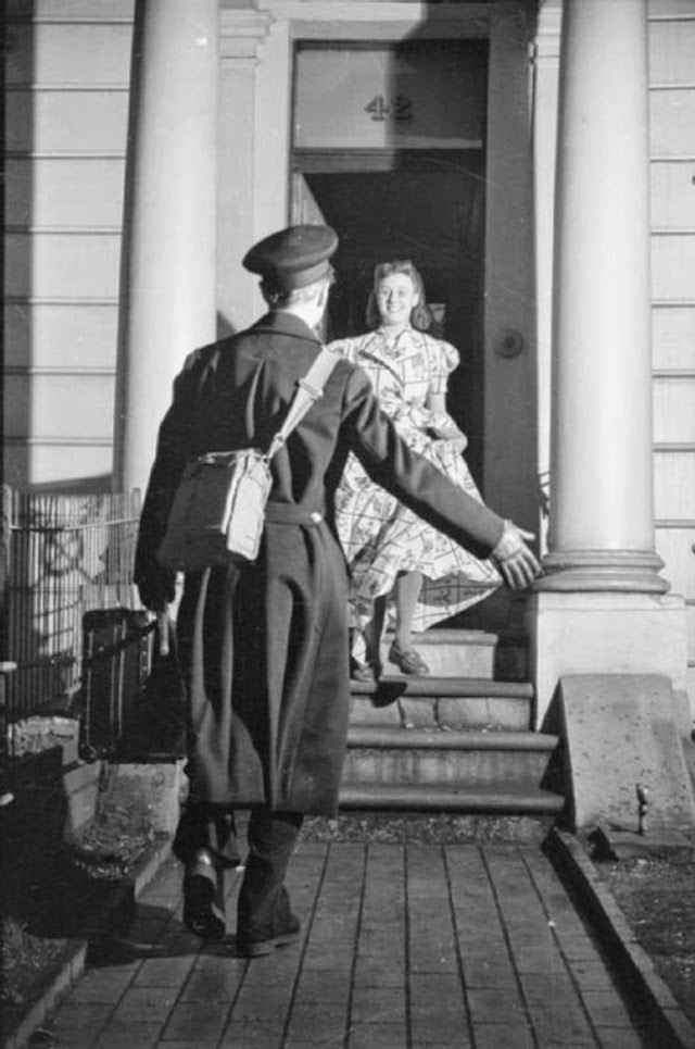 Mrs Day runs to greet her husband Lieutenant Kenneth Day at the door of her South Kensington home as he arrives home on leave. |