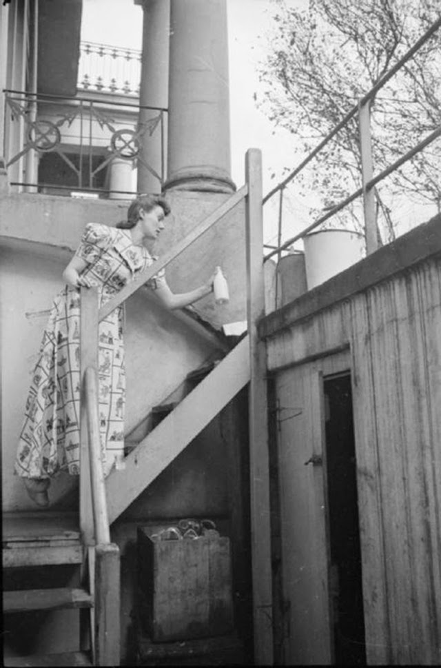 Mrs Day collects the milk and newspapers from the top of the steps leading down to the basement of her South Kensington home. The buckets that can be seen on the street at the top of the steps contain sand and water and are provided in case of fire bombs. |