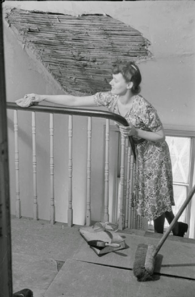 Mrs Day spends half an hour or so on the housework before she leaves for work. Here we see her polishing the bannisters. Above her head, we can see a large patch of missing plaster on the ceiling, caused by a nearby air raid. |