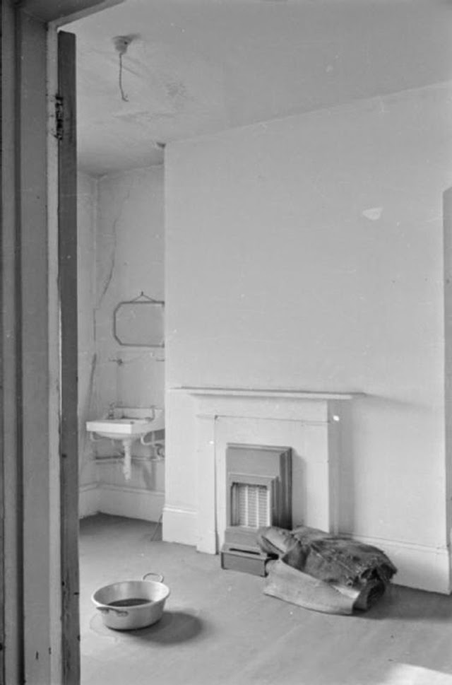 The top floor of Mrs Day’s South Kensington home is no longer in use. Here we see an empty room with a bowl on the floor to catch any drips of rain water that may come in through the bomb-damaged ceiling. |