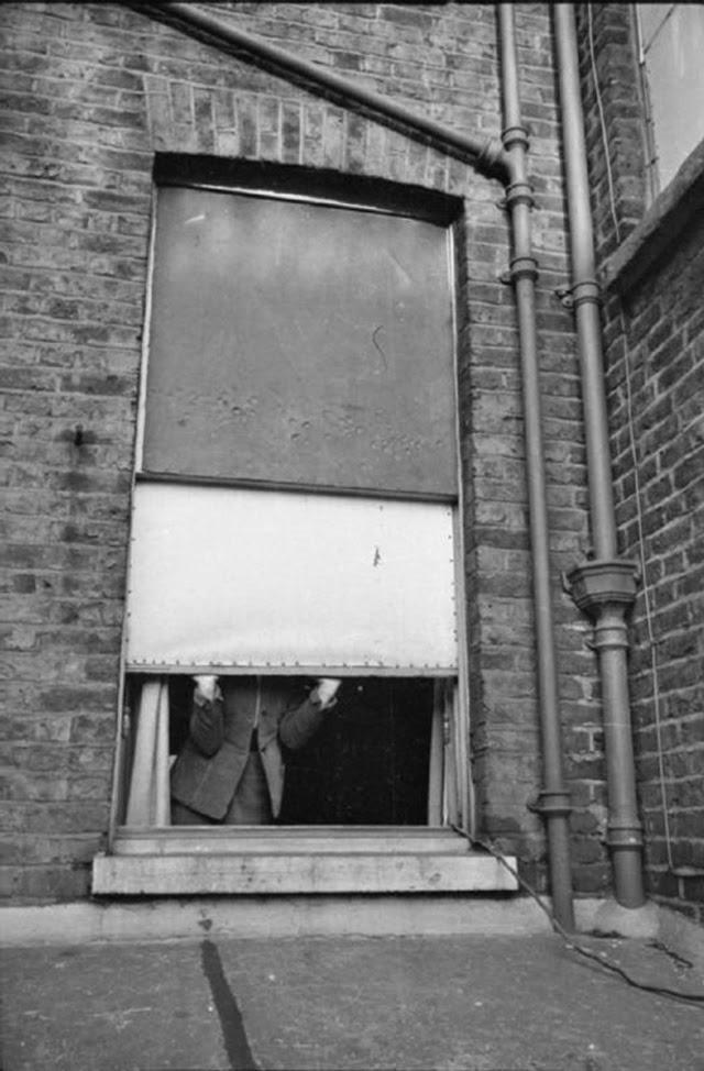 Mrs Day opens the curtains of her bedroom in the basement of her South Kensington home. Unfortunately, as the glass has recently been knocked out of the windows by a nearby air raid, Mrs Day cannot see outside, as oiled linen has been stretched across the windw frame in place of the missing glass. Her cat ‘Little One’ watches her from the bed. |