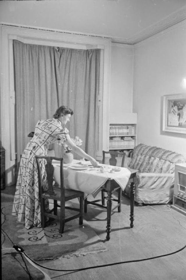 Mrs Day sets the table in preparation for the evening meal in the sitting room of her South Kensington home. She is expecting her naval husband Lt Kenneth Day to arrive home on leave, so the table is set for two and a vase of flowers has been added. |