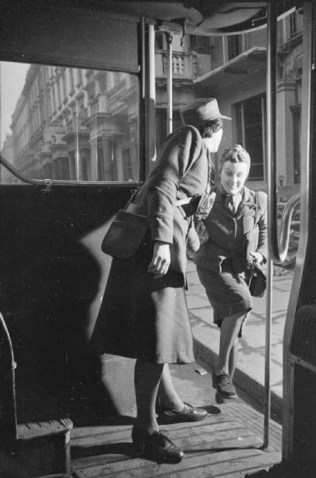 Mrs Day is helped by a female conductor onto the bus that will take her to work. This photograph was probably taken on Fulham Road. |