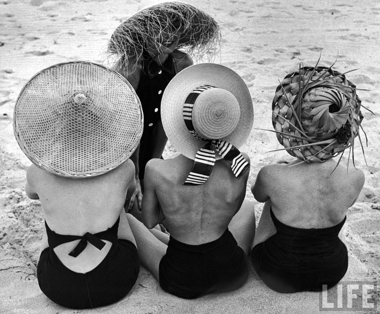 A collection of black and white photo shoots of models on Florida beach wearing different designs in May 1950.