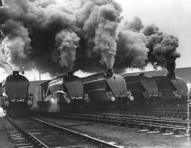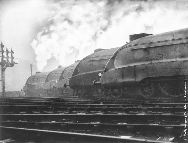 | A row of LNER streamlined locomotives belch out smoke at a London railway station, where they are to be tested out. From the left, they are Dominion of New Zealand, Golden Shuttle, Empire of India, Golden Eagle and Number 10,000 R. (Photo by Fox Photos/Getty Images). 1937 |