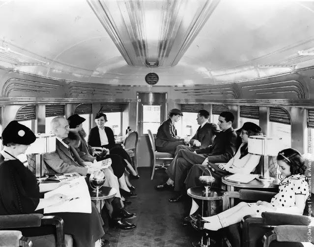 | Passengers in the spacious lounge car on the new streamlined diesel train “Green Diamond”, introduced by the Illinois Central System to run fast services between Chicago and Illinois. (Photo by Fox Photos/Getty Images). Circa 1935 |