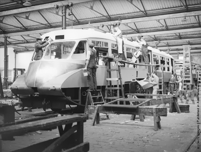 | A Great Western Railways streamlined train under construction at the Swindon Works. (Photo by Fox Photos/Getty Images). June 1935 |