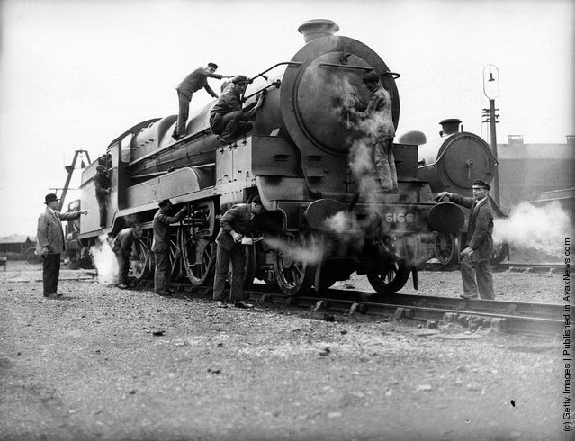 | Cleaning the express locomotive “Earl Haig” at the Neasden loco sheds of the LNER (London and North Eastern Railway). (Photo by Fox Photos/Getty Images). 8th September 1932 |