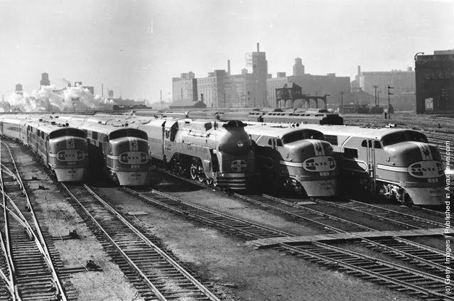 | Five of the new streamlined trains being introduced by the Santa Fe Railway to run between Chicago and Los Angeles as part of the largest streamlined fleet in the world. (Photo by Fox Photos/Getty Images). 11th March 1938 |
