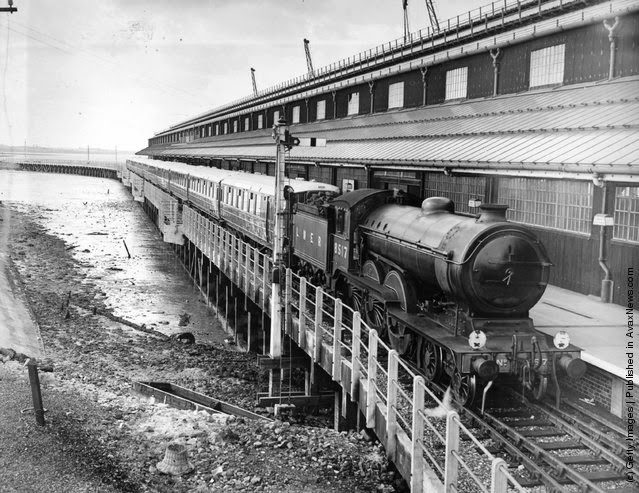 | A new soundproofed and air-conditioned London and North Eastern Railway train at a quayside station in Harwich, Essex. (Photo by J. A. Hampton/Topical Press Agency/Getty Images). 6th October 1938 |