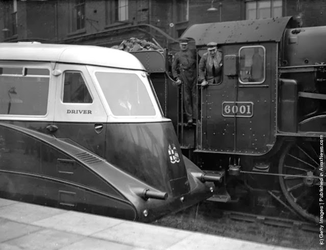 | Two men driving an old 250-ton steam engine admire the new 135-ton streamlined Cornish Riviera Express engine on the track beside them. (Photo by PNA Rota/Getty Images). December 1933 |