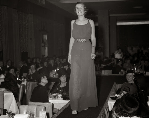 | The catwalk hasn’t changed much in over 75 years. Here, a model walks the runway at a 1935 society fashion show. |