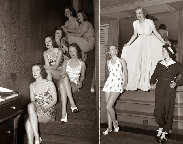 | No skimpy two-pieces here! Models in 1939 show off the swimsuit style of the day (l.), while three models each display different looks in 1938 (r.). |