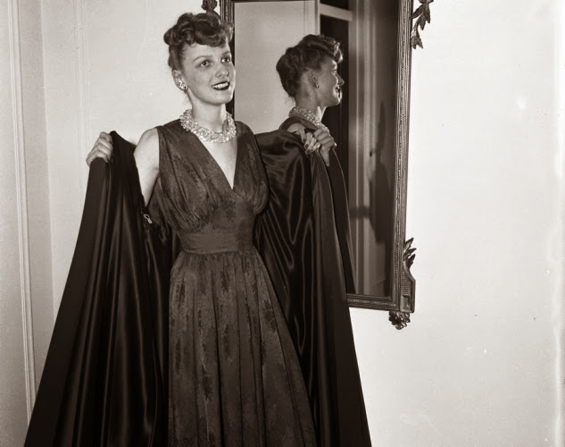 | Apparently plunging necklines were always a staple in fashion! This model showcases an elegant evening dress with a Victoria Nyanza cape in 1938. |
