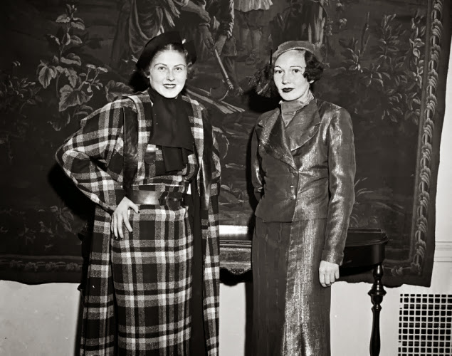 | Model Mona Mora (l.) wears a gray woolen coat dress with a removable sailor collar, and Lee Sherman (r.) wears a bright green tweed fall suit with a matching gray krimmer fur high crown fabric hat at a 1933 fashion show at Hotel Pennsylvania. |