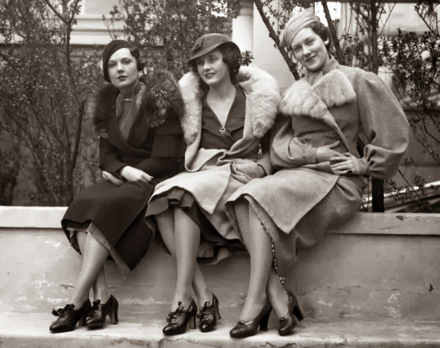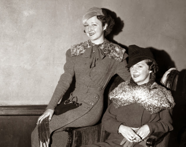 | Two models cover up in fashionable women’s suits at a 1933 show. |