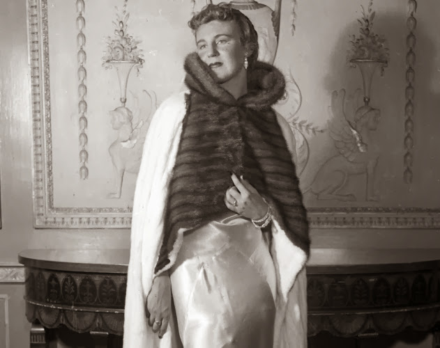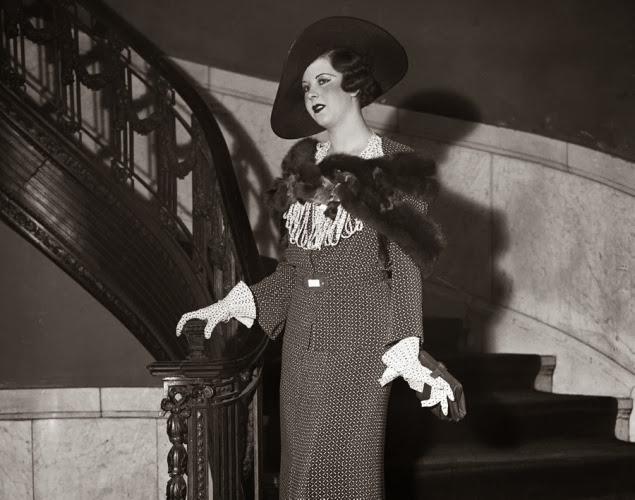 | Model Jean Early poses on the staircase at a 1934 summer fashion show while completely decked out in an elegant suit with a fur cape and hat. |