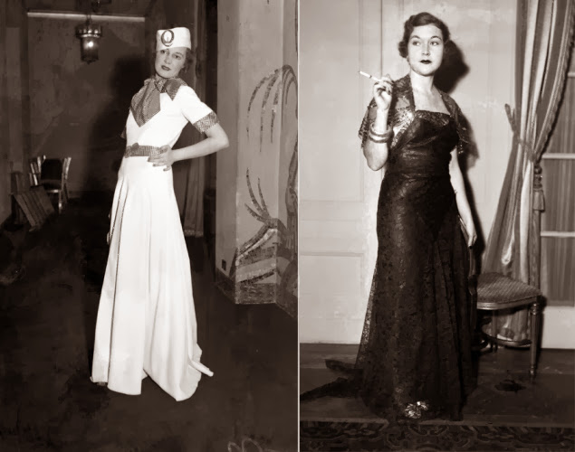 | Ahoy matey! Model Diane Beauchamp wears a sailor-inspired white pique dress at a 1935 fashion show (l.), while a 1933 model goes for a darker look in a sequin-trimmed dress in 1933 (r.). |
