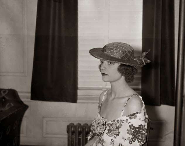 | A model wears a navy plaid silk bonnet during a 1935 fashion show … now if only she’d wear a smile! |