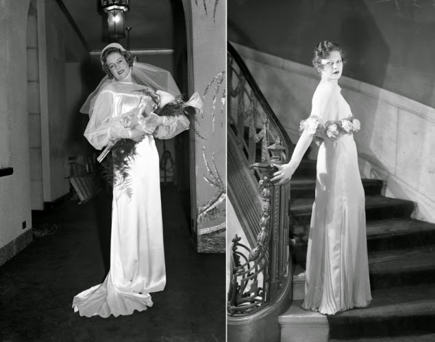 | 1930s glam! Diane Beauchamp wears a white satin wedding gown in a fashion show in 1935 (l.), while Gilda Farrell models a gray chiffon night dress in 1933 (r.). |