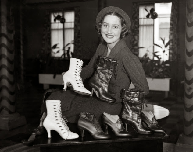 | Shoes galore! A model sits behind a stylish display of boots in 1934. |