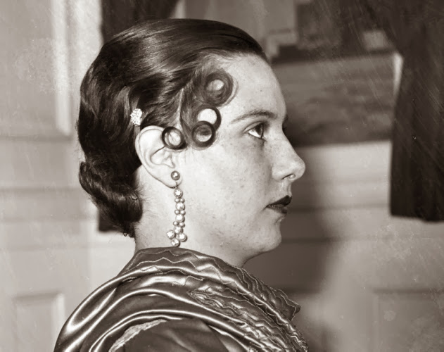 | Looking very severe, a model shows off a distinctly 1930s hairstyle with curls above the eye and her hair pulled tightly back. |