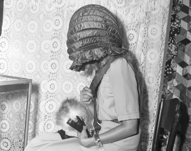 | We thought models liked to show off their beautiful faces, but apparently in 1941 the folding bonnet was all the rage. |