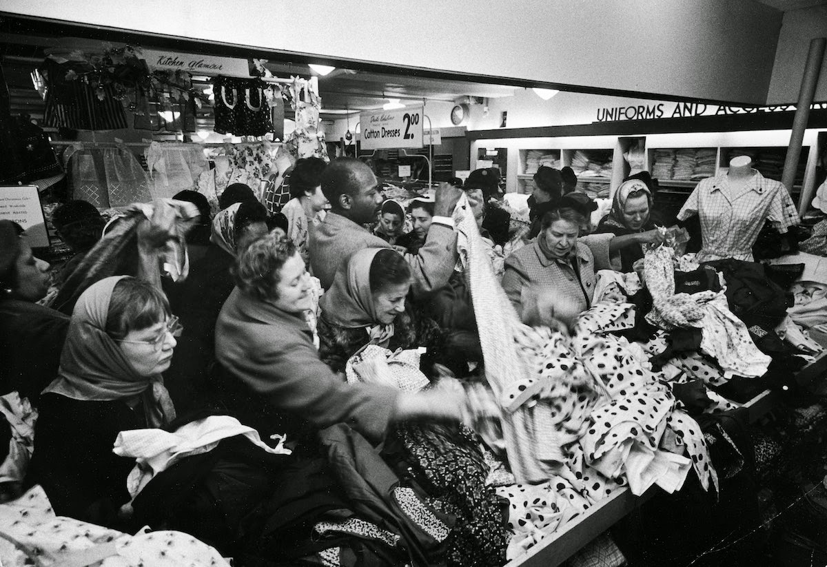 December 1955. A frenzied crowd of women grab at dresses during a Christmastime bargain sale. IMAGE: RALPH MORSE/LIFE MAGAZINE/THE LIFE PICTURE COLLECTION/GETTY IMAGES |
