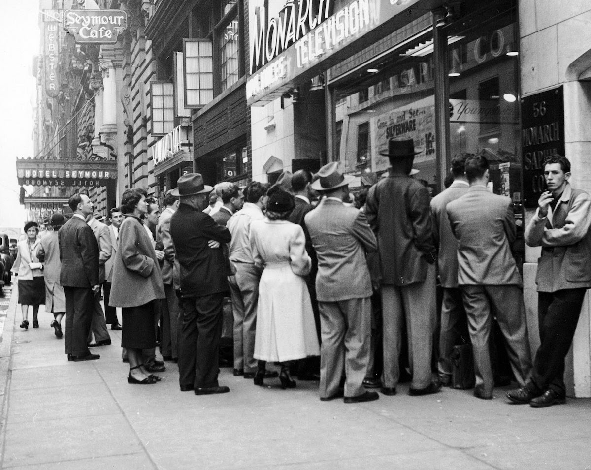 c. 1945. A group of men and women stand on a city sidewalk, looking in the window of an appliance store during a sale. IMAGE: HULTON ARCHIVE/GETTY IMAGES |