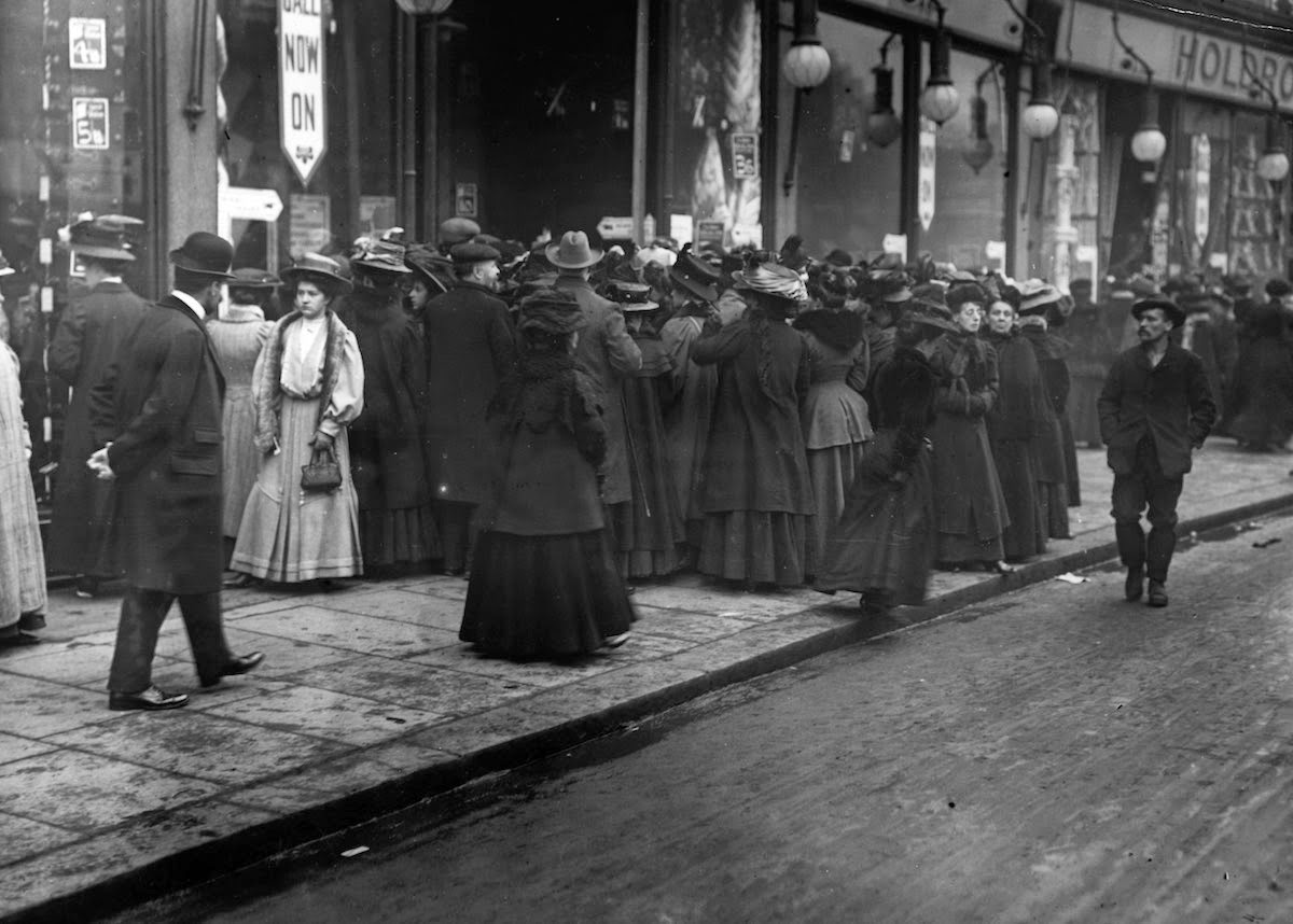 c. 1906. Bargain hunters waiting to enter a London shop during January sales. IMAGE: TOPICAL PRESS AGENCY/GETTY IMAGES |