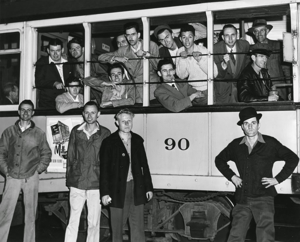 | This amazing Roy Finley photo captures the railfan riders of the final Los Angeles Railway A Line car (no. 90) on June 30th, 1946, at 4AM at the intersection of 7th and Hill streets in downtown Los Angeles. Roy Finley Photo, Chard Walker Collection, Pacific Railroad Society Collection |