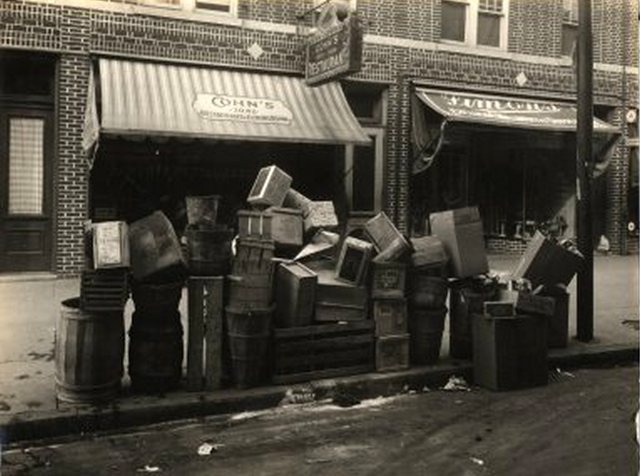 2042-86th Street, Brooklyn. Cohn’s Restaurant & Dining Room. Crates, barrels, boxes, cans stacked on curb |