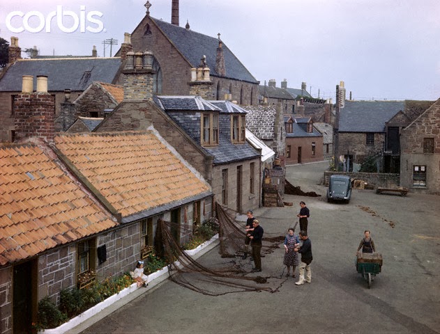 | 1946, Scotland, UK — A man and his wife and some helpers mend fishing nets in a street — Image by © B. Anthony Stewart/National Geographic Society/Corbis |
