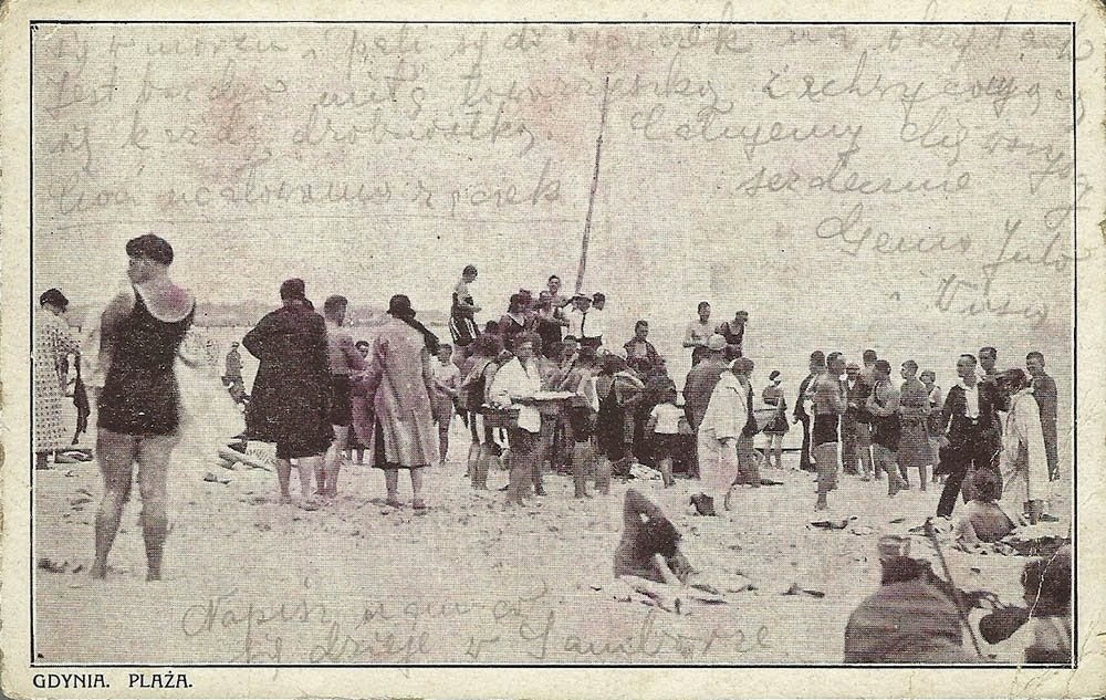 Wakacje na plaży w Gdyni-Orłowie, lata 30. XX w. Źródło: pocztówka ze zbiorów Alicji Młyńskiej |