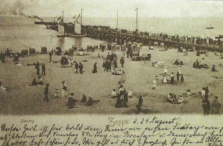 Widok fragmentu plaży i molo, pocztówka z 1903 r. Źródło: dodatek specjalny do „Dziennika Bałtyckiego”, styczeń 2001, s. 5 |