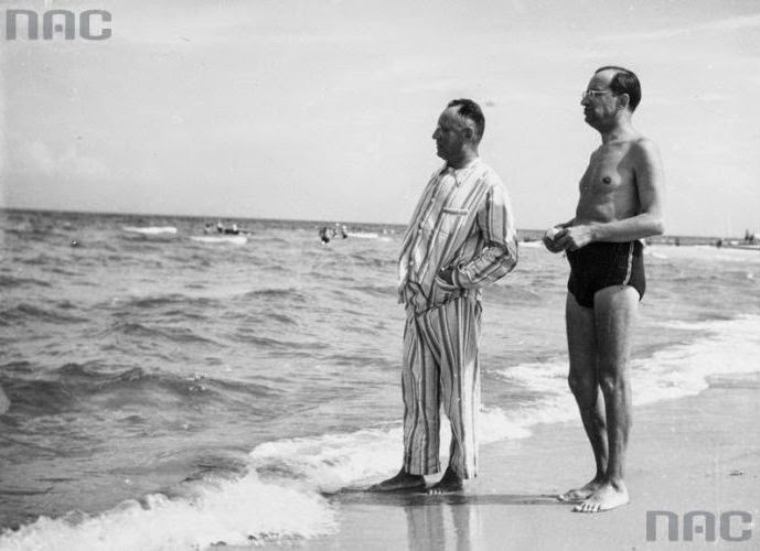 Mieszkaniec Krakowa Mieczysław Kaplicki (w piżamie) w towarzystwie wojewody kieleckiego Władysława Dziadosza na plaży, 1937. Fot. Narodowe Archiwum Cyfrowe |