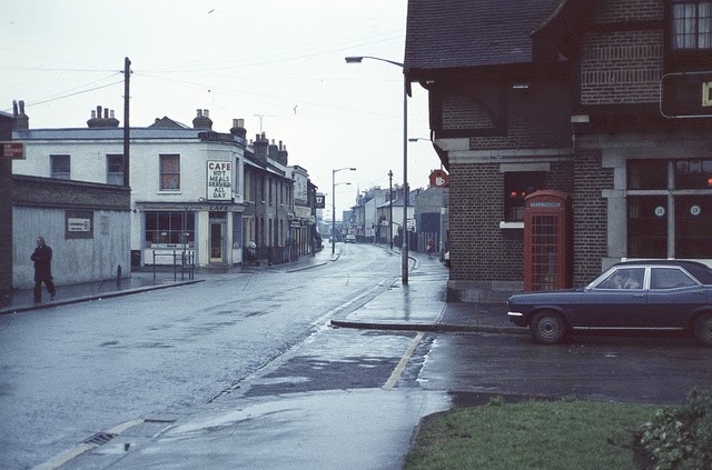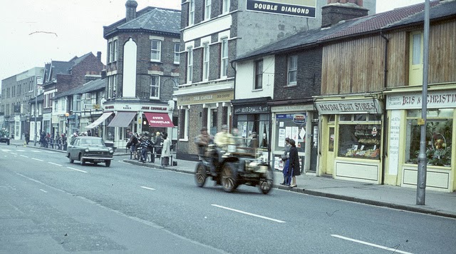 | Canterbury Rd 1969 opposite junction of Priory Rd. Brick building on right is next to Allders Warehouse (Nos 76-78) previously the Ebbutts Warehouse. The carriage has “Box Hill” sign-painted on rear. |