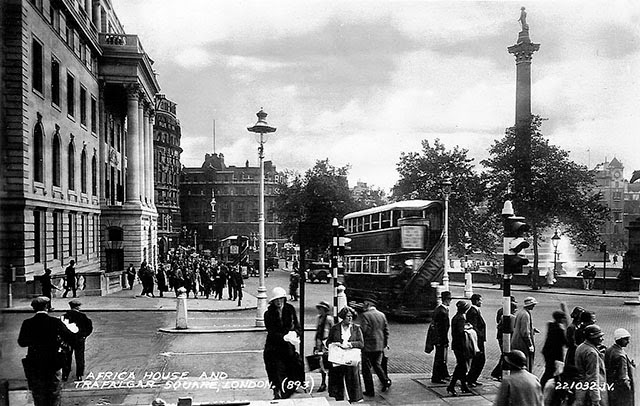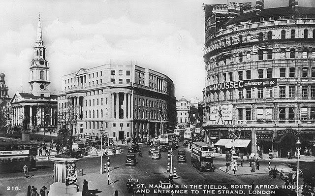 | The photographer has taken this photograph from the corner of Duncannon Street and St. Martin’s Place actually on the steps of St. Martin in the Fields. It is the mid thirties, South Africa House has just been completed in 1933 but the fashions seem strangely 1920s. |