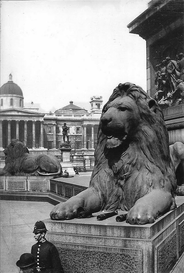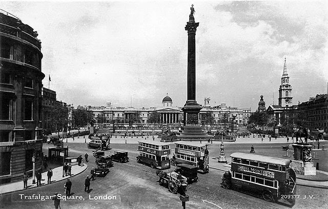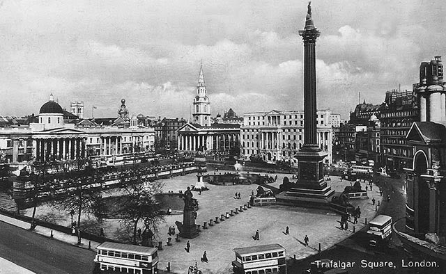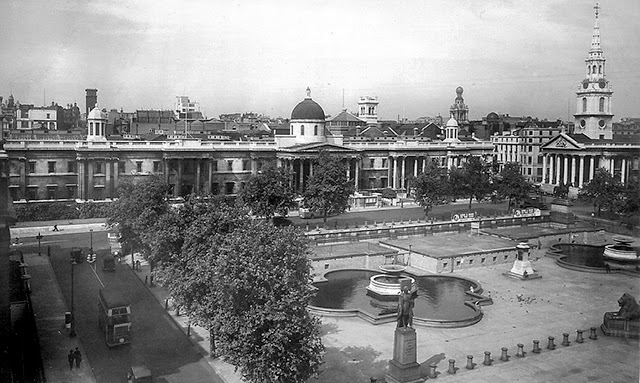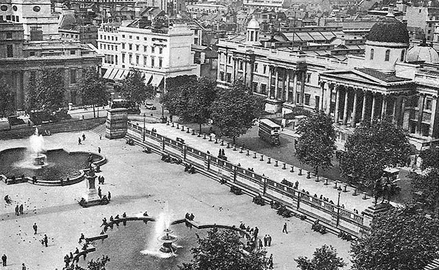 | An early 1930s photograph of the north east corner of Trafalgar Square with the National Gallery in the background. |
