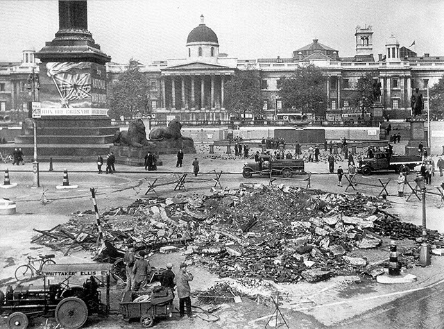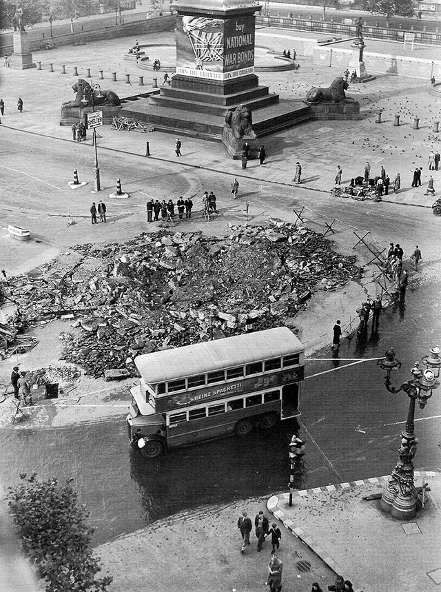 | Another view of the bomb crater and clear view of the bomb shelters on Trafalgar Square. |